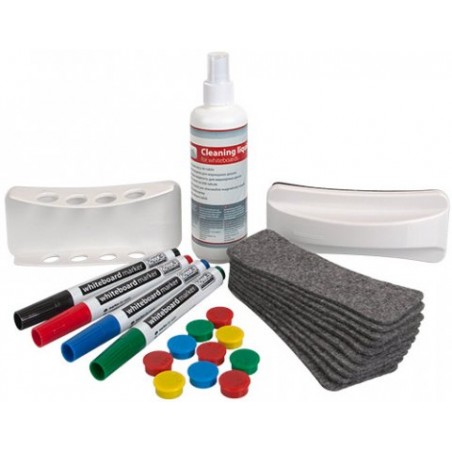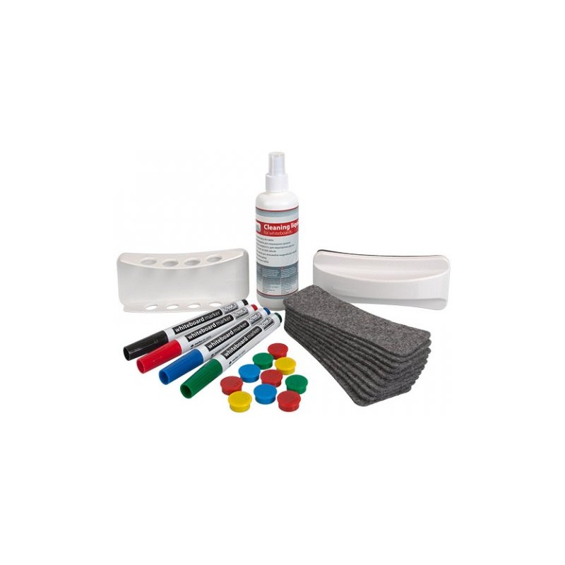 Zestaw przeznaczony do tablic suchościeralno-magnetycznych, zawiera: 4 markery, holder magnetyczny do markerów, płyn czyszczący 200 ml, czyścik magnetyczny, wymienne filce oraz magnesy (10 x 20 mm).