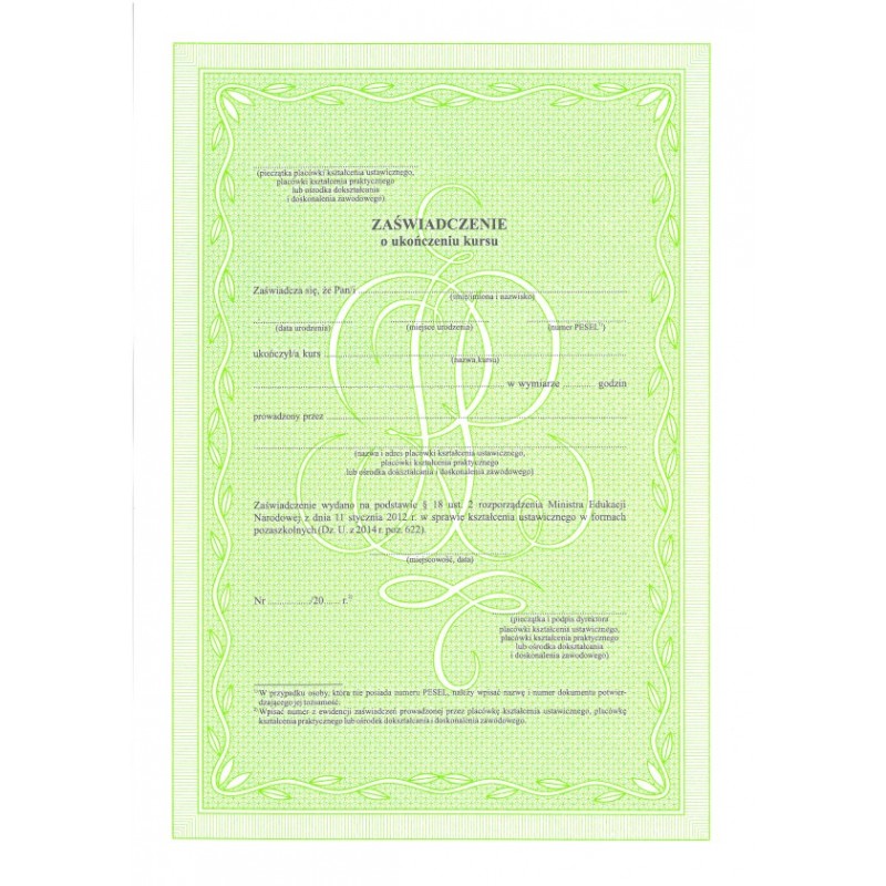 ZAŚWIADCZENIE O UKOŃCZ. KURSU A4 ZIEL.