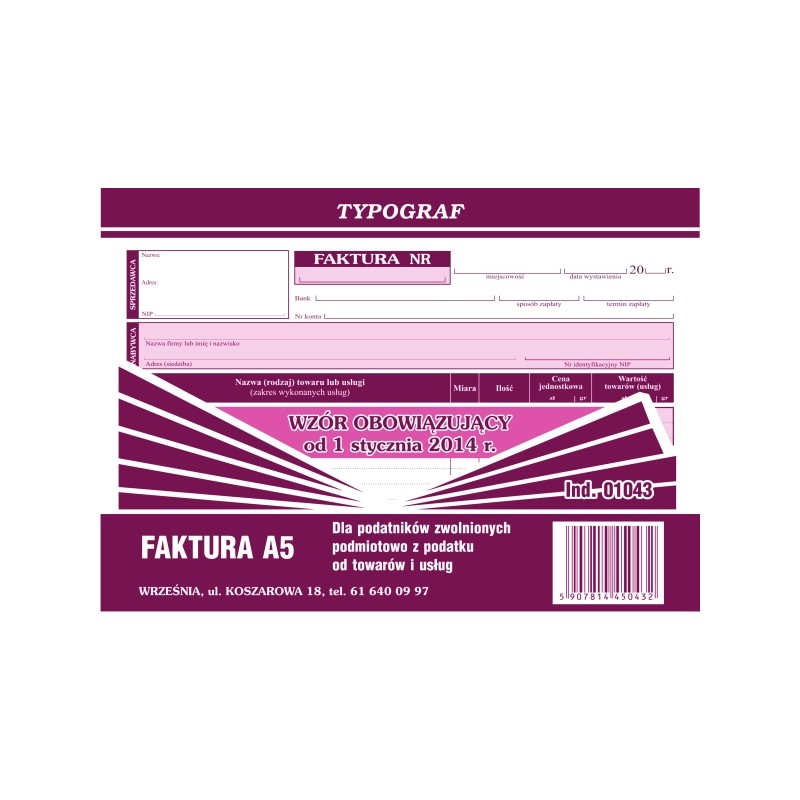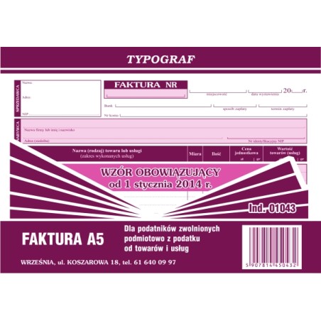 FAKTURA A5 (s) BEZ VAT POZIOM TYPOGRAF 01043
