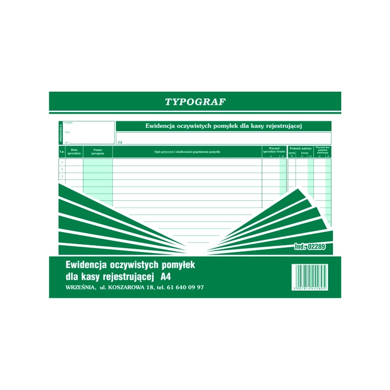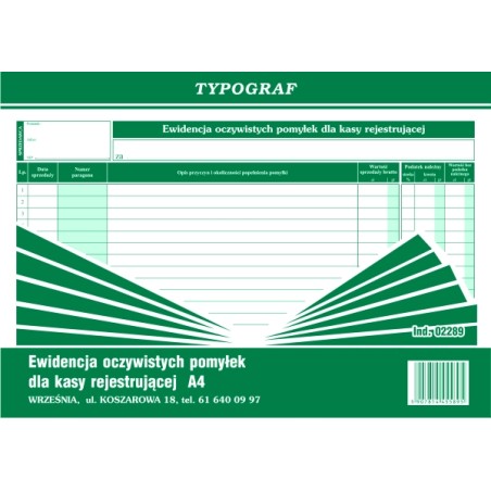 EWIDENCJA OCZYWISTYCH POMYŁEK DLA KASY REJ. 02289
