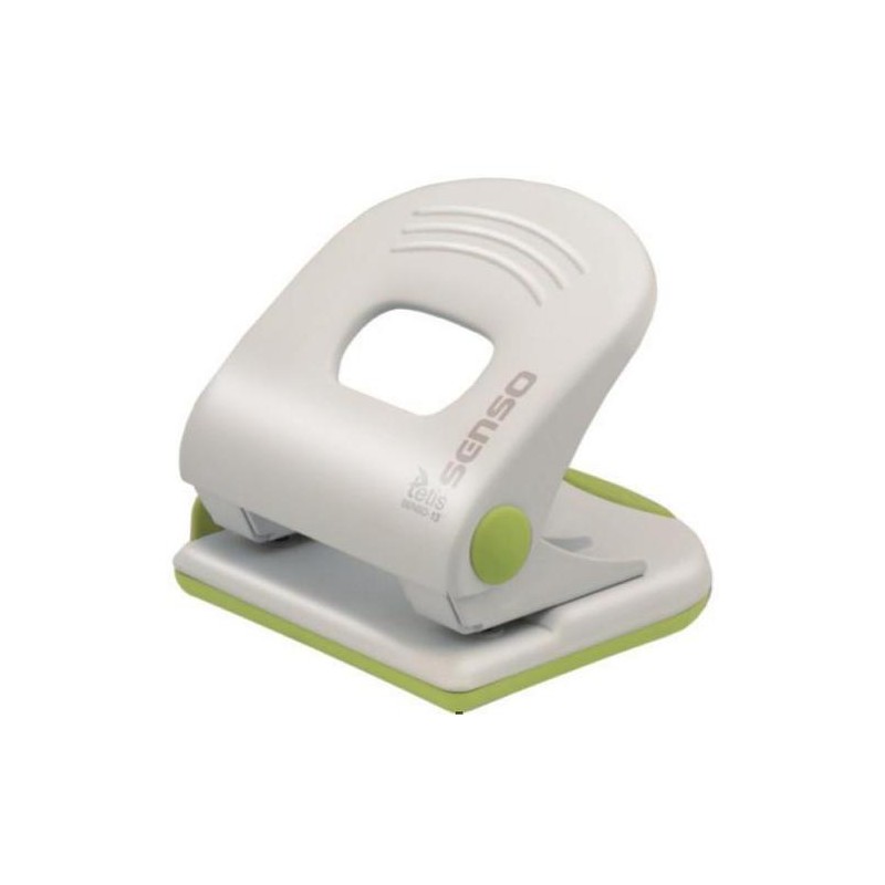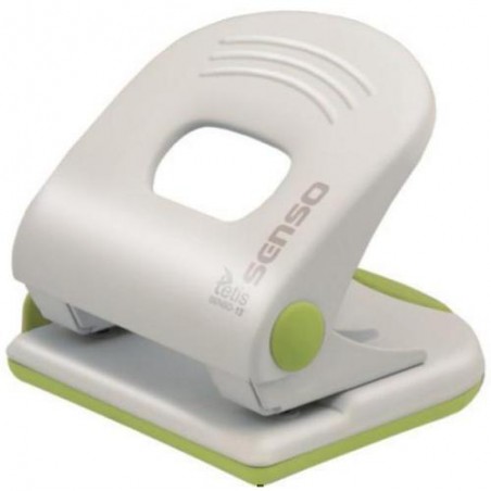 Metalowy dziurkacz biurowy z wykończeniami z tworzywa sztucznego. Posiada