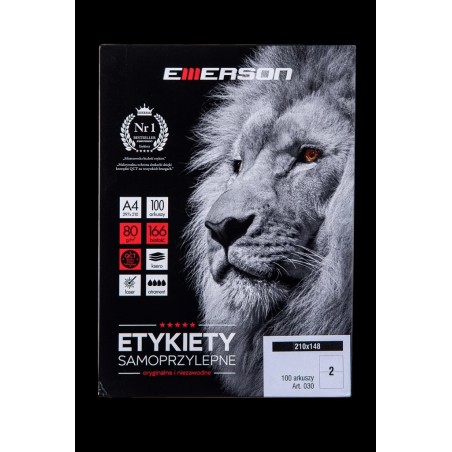 Etykiety samoprzylepne dostarczane na arkuszach o formacie A4. Etykiety są wielozadaniowym produktem marki Emerson, którego cechuje najwyższa jakość oraz niezwykła wytrzymałość. Z łatwością można go wykorzystać jako etykiety inwentaryzacyjne, jako korespondencja seryjna, a także do oznaczania teczek, segregatorów, dokumentów etc.
