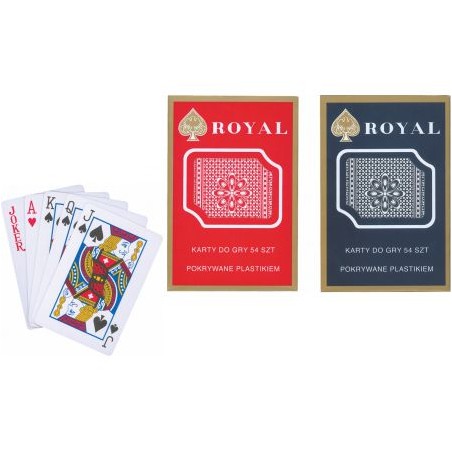Plastikowe karty do gry. 2 komplety w dwóch kolorach: czerwonym i granatowym. Karty o wymiarach pokerowych.