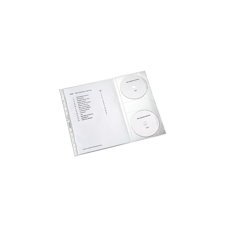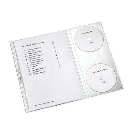 Koszulki z boczną kieszenią na 2 płyty CD. Pasek z otworami do wpięcia w segregatory pozwala na wygodne przechowywanie dokumentów i CD.