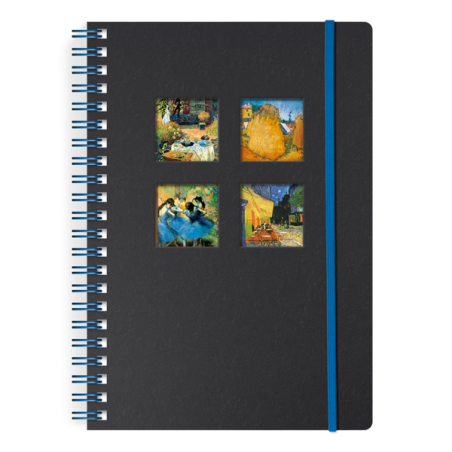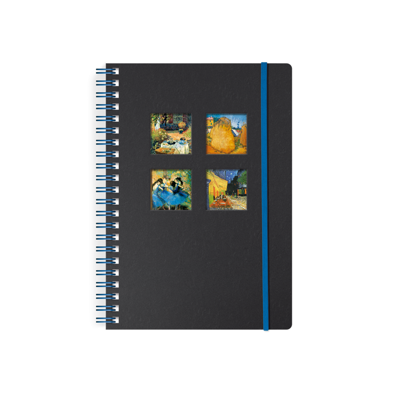 okładka wykonana z czarnego kartonu barwionego w masie 700g z wycięciem pod nadruk pełnokolorowy, spirala i gumka niebieska