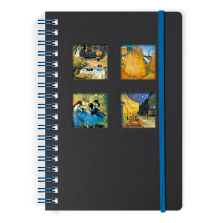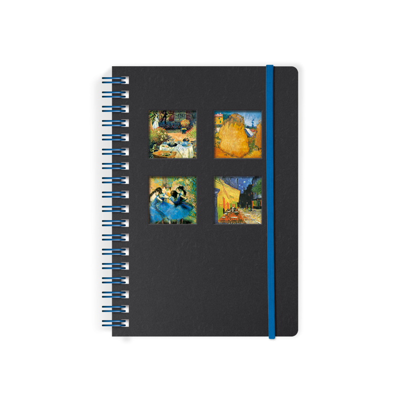 okładka wykonana z czarnego kartonu barwionego w masie 700g z wycięciem pod nadruk pełnokolorowy, spirala i gumka niebieska |