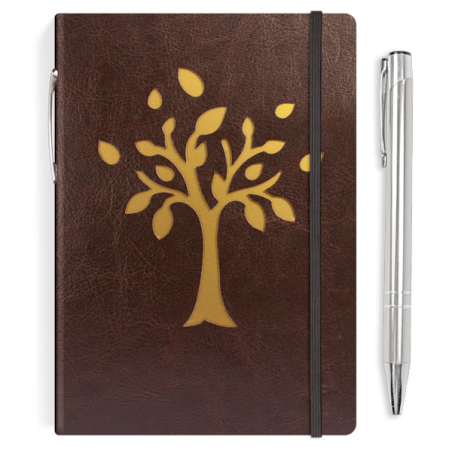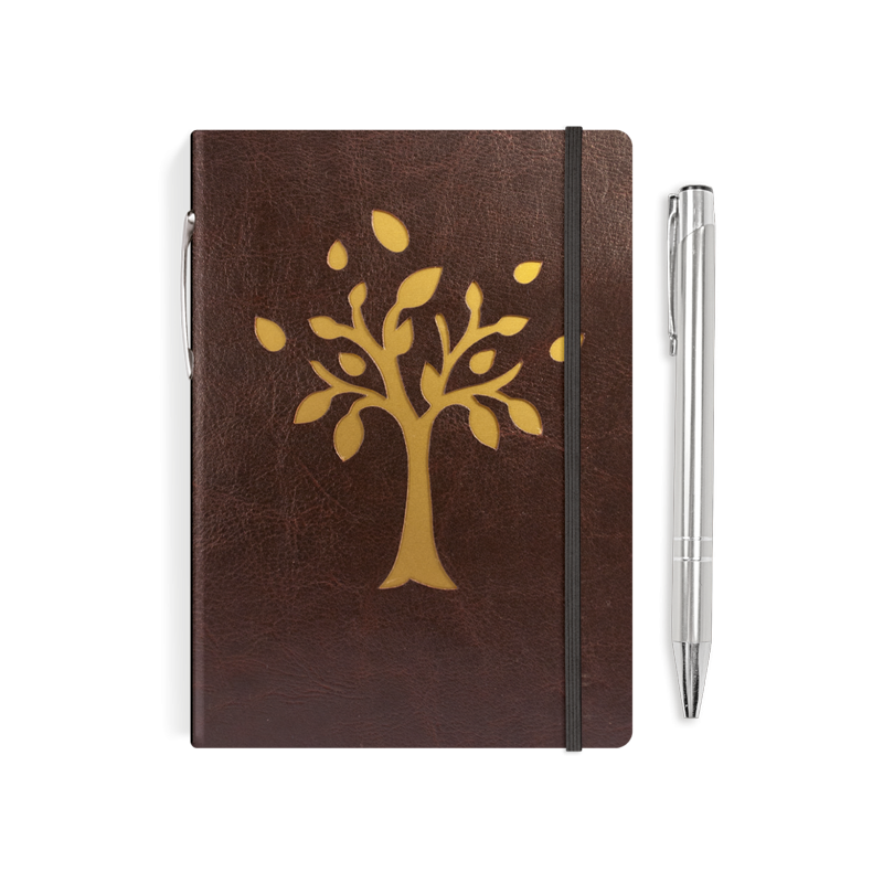 okładka z termoprzebarwialnej ekoskóry, wizerunek drzewa na metalicznym złotym papierze ozdobnym, metalowy długopis, czarna gumka zamykająca |