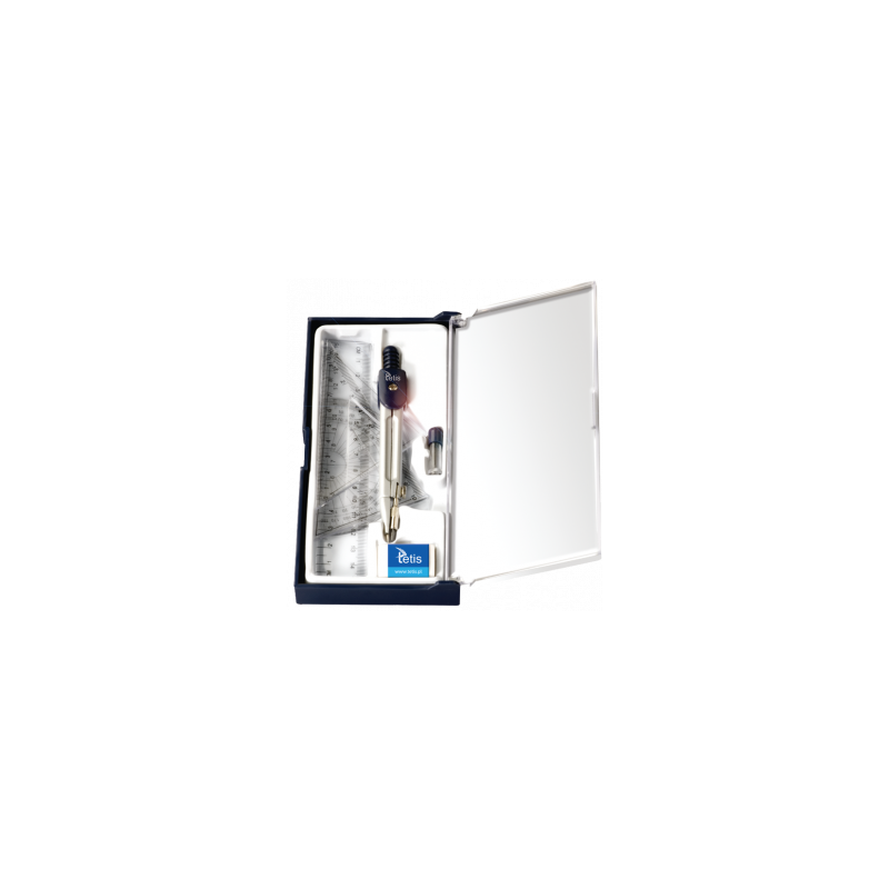 Komplet zawiera: cyrkiel, 2 ekierki, linijkę, kątomierz, gumkę ołówkową oraz zapasowe grafity /2 sztuki/.