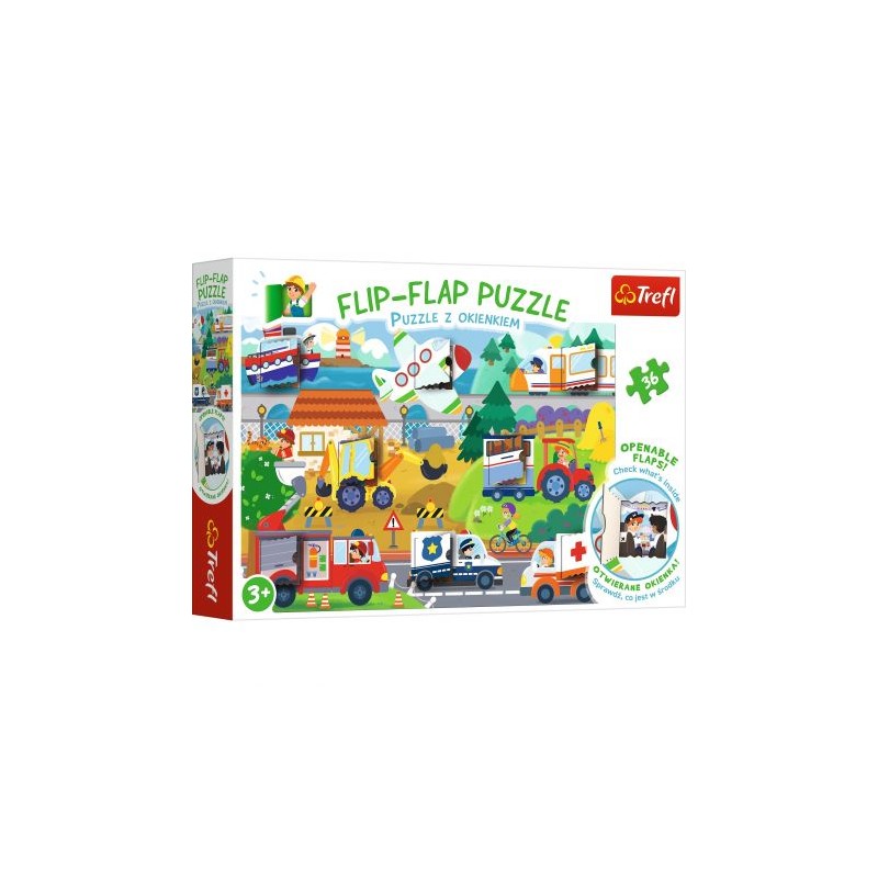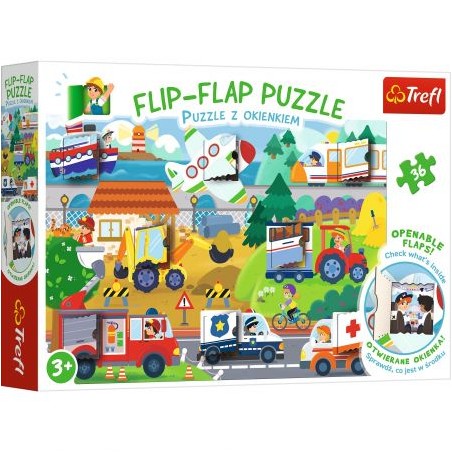puzzle - Pojazdy to duże, tematyczne układanki z otwieranymi okienkami. Po